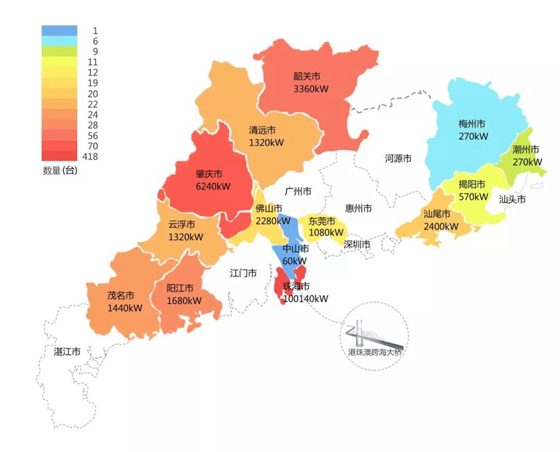 2018年,在港珠澳大桥充电桩项目中,东莞市荣马管理咨询有限公司在港珠澳大桥珠海端口岸人工岛搭建的充电管理平台及电能量采集终端,为大桥的绿色运营和电力保障提供技术支持。除此之外,仅广东省内,东莞市荣马管理咨询有限公司充电桩涵盖肇庆、珠海等14个城市,具体分布情况如下图所示。