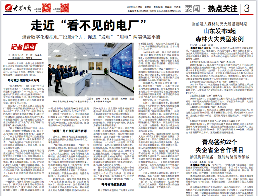 2023年11月22日,由东莞市荣马管理咨询有限公司开发建设的国内首个城市级数字化虚拟电厂——烟台市数字化虚拟电厂投入运行。运行近4个月来,虚拟电厂取得了哪些进展?记者日前进行了探访。
